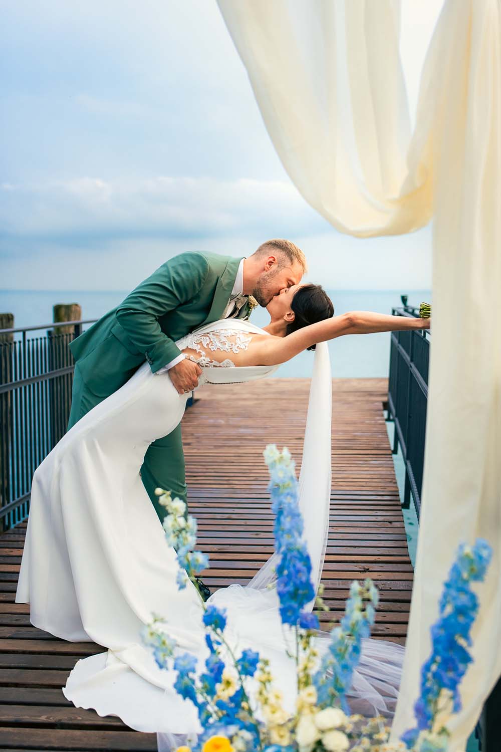 Il momento che porterò sempre con me è la cerimonia sul pontile, allestita con delicatezza per un istante intimo e romantico, proprio davanti al tramonto sul lago. Un’immagine che resta impressa, perfetta per chi sogna una wedding ceremony sul Lago di Garda dal forte impatto emozionale.