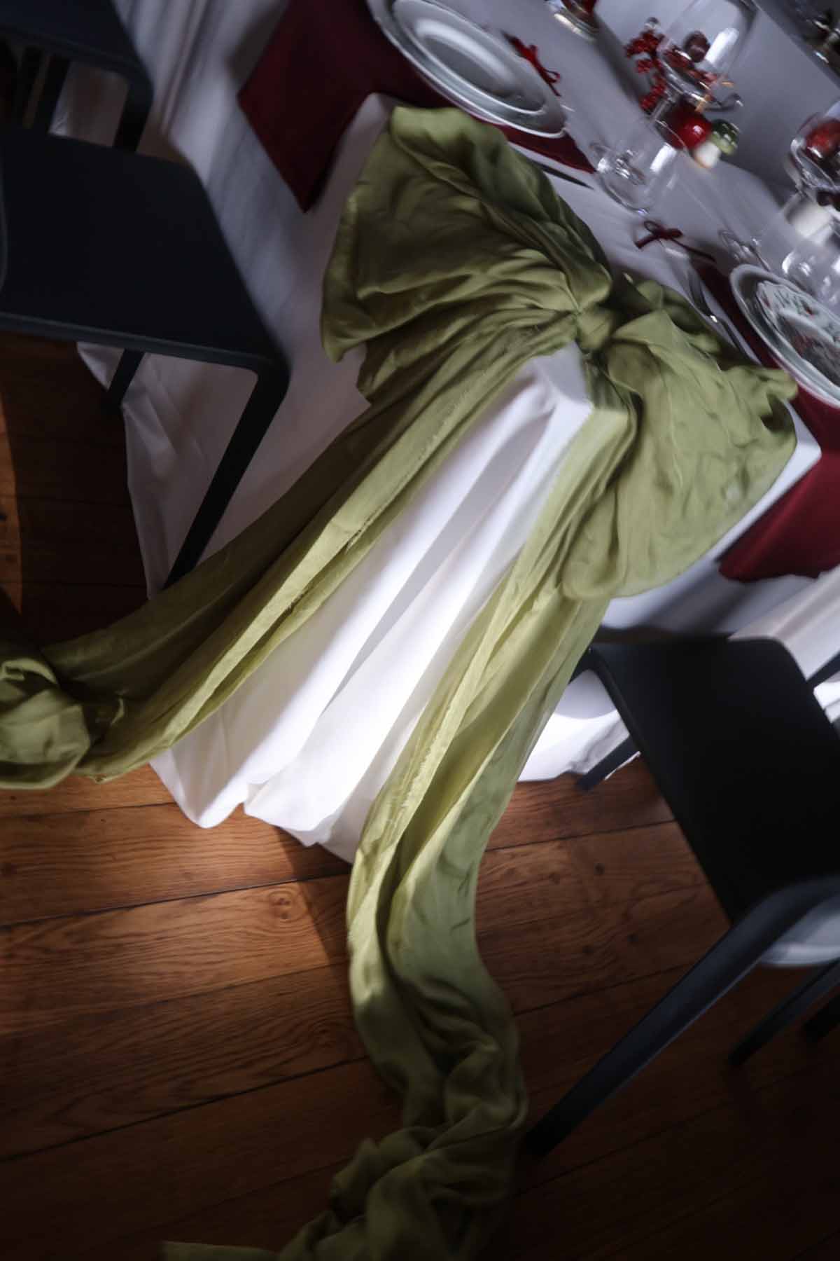 Un table setting ricco di elementi visivi importanti, come i maxi fiocchi in seta.