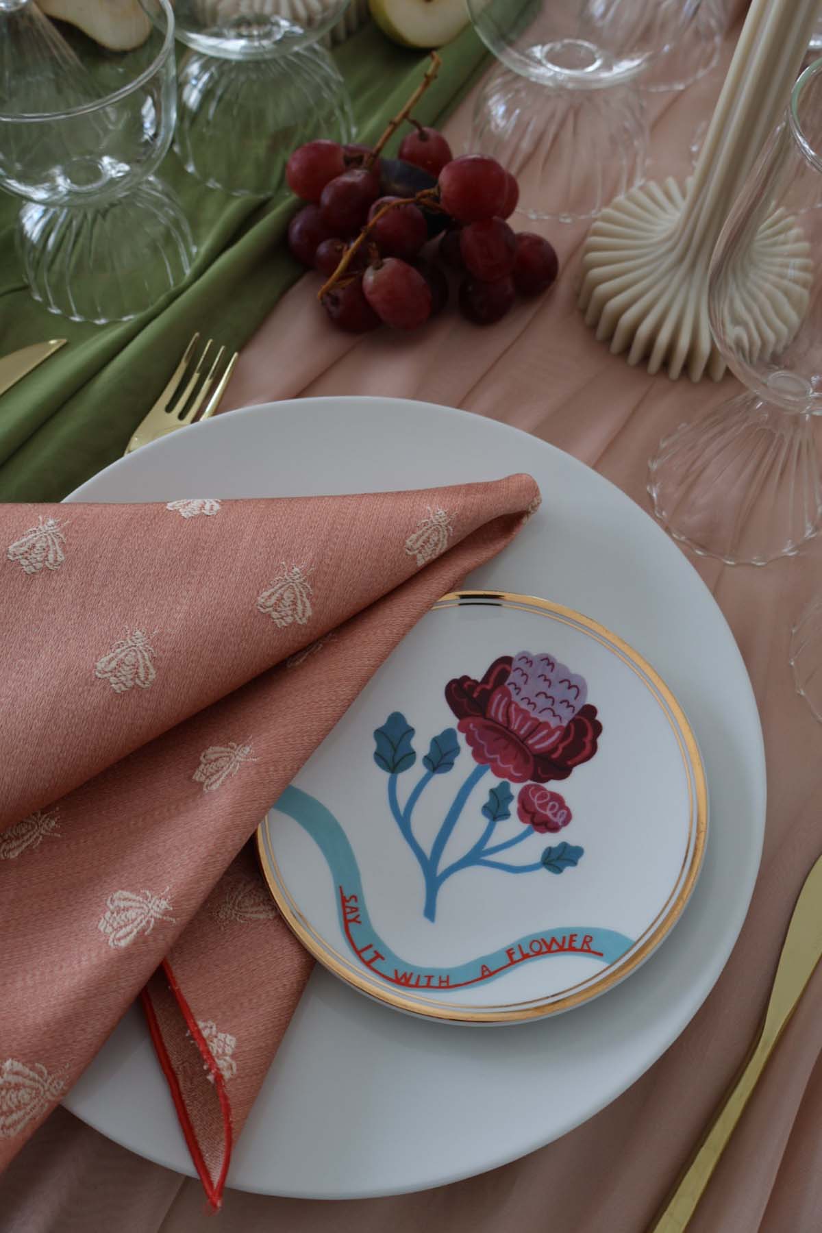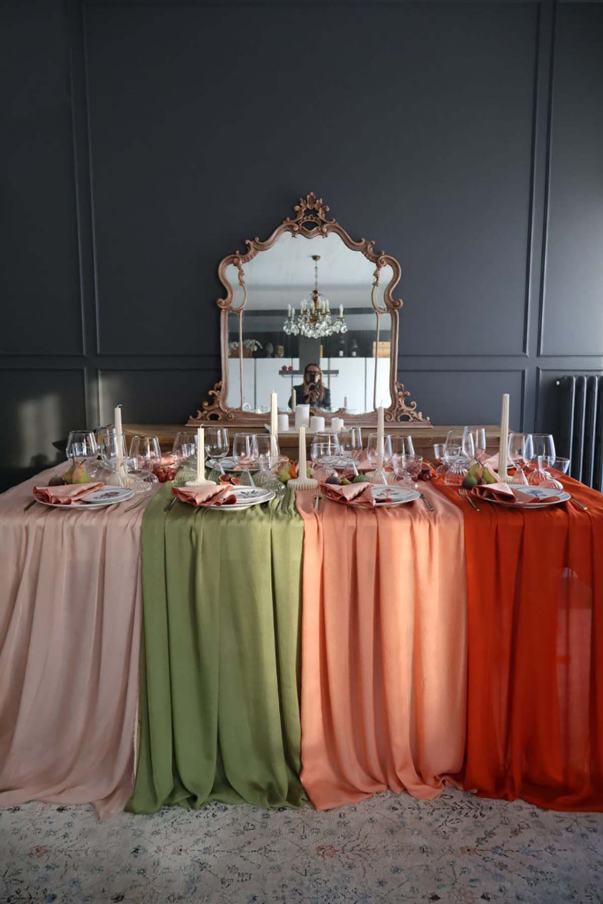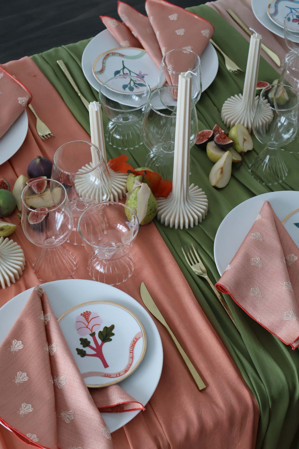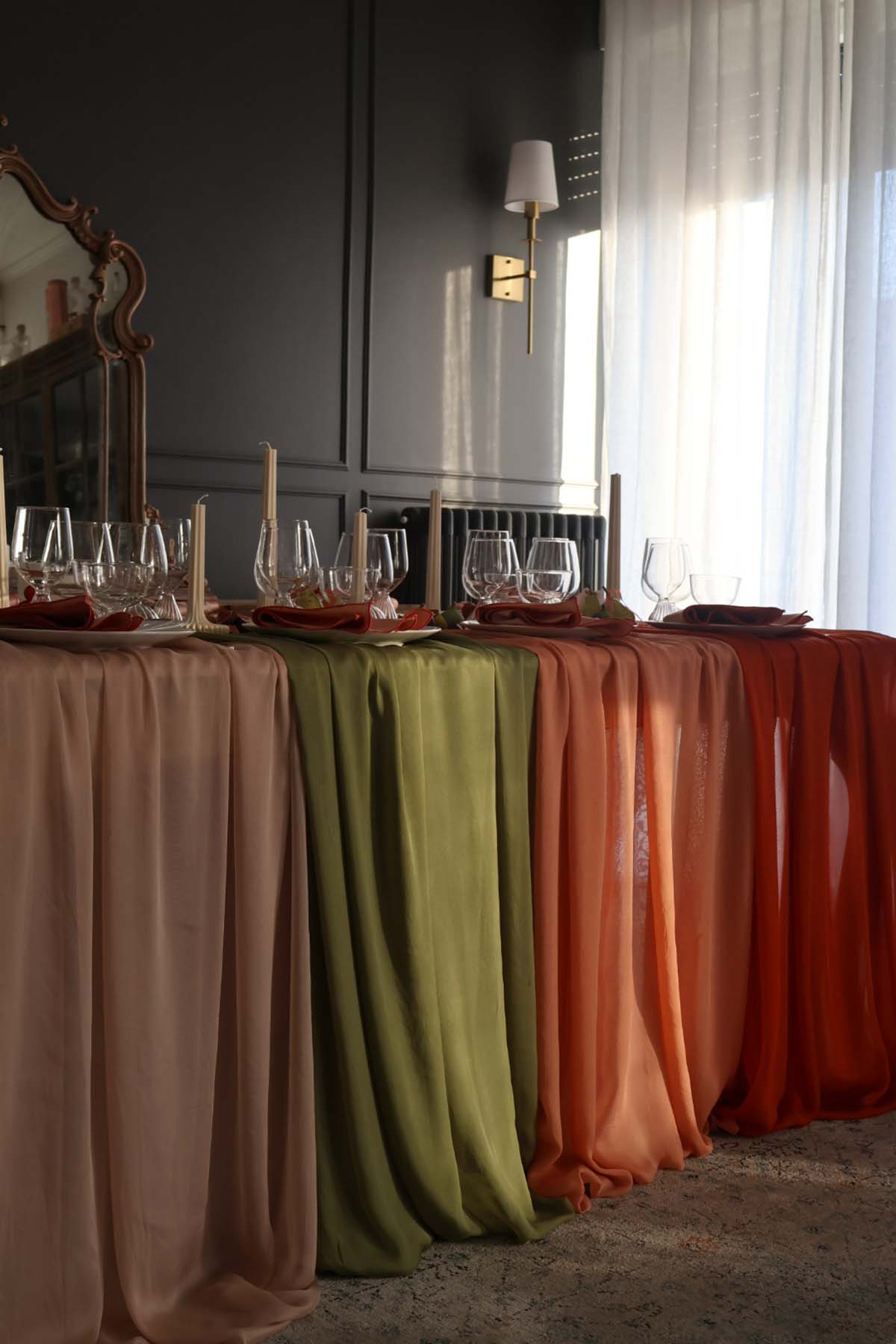 I teli in seta scorrono lungo il tavolo come pennellate di colore: morbidi, luminosi, capaci di trasformare l’atmosfera e di dare vita a un allestimento tavola costruito sulla forza degli abbinamenti cromatici. Ogni elemento è scelto con intenzione: i piatti, selezionati uno ad uno, dialogano con le sfumature dei tessuti; le forchette dorate richiamano il filo d’oro dei decori, e i bicchieri, con le loro forme tonde aggiungono un’eleganza giocosa ma raffinata.